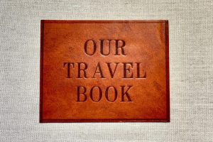 En la portada hay una etiqueta de piel de ciervo con un texto grabado en relieve: OUR TRAVEL BOOK.