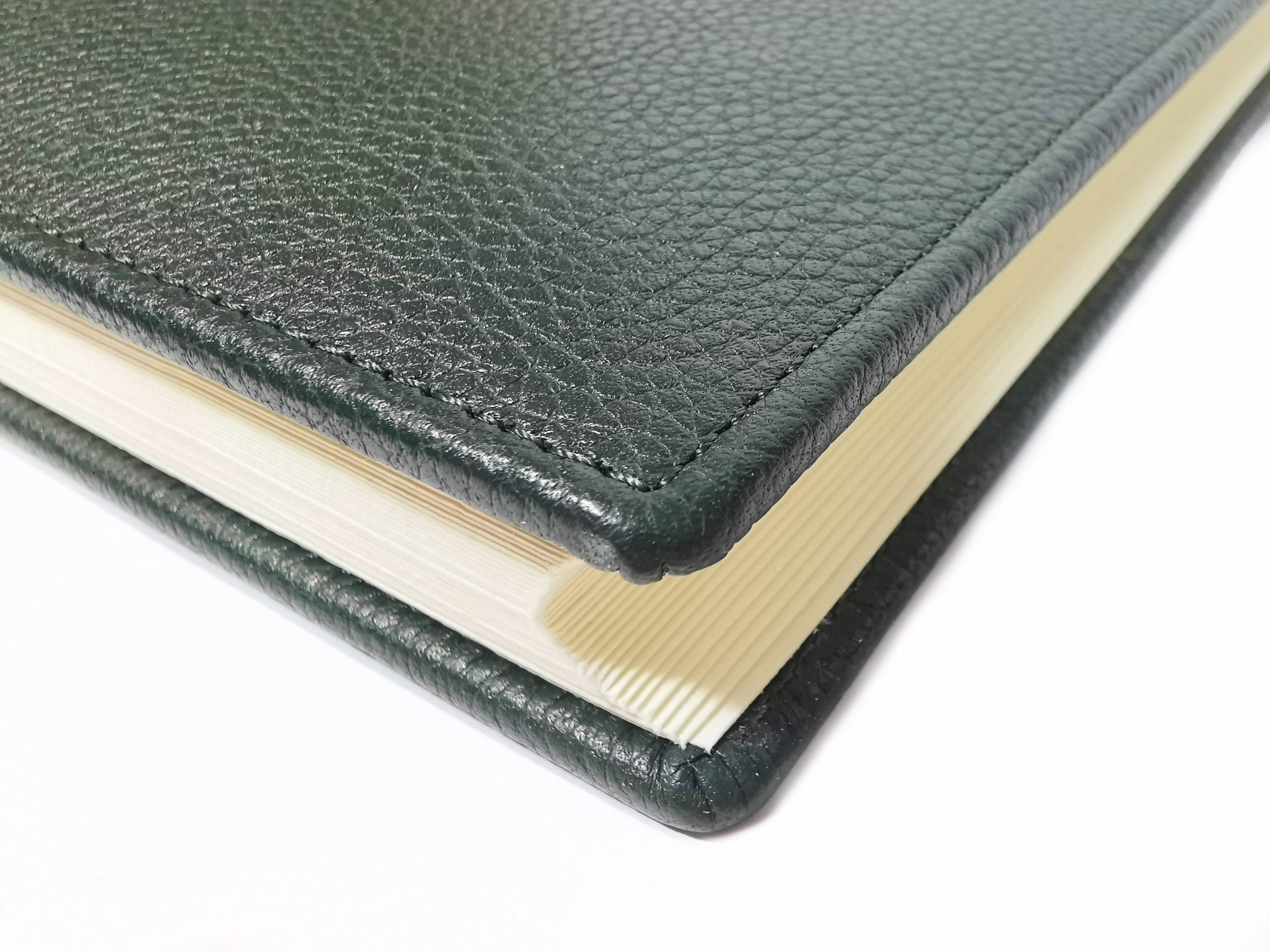 Material de cubierta: Piel de vacuno color verde. Terminación con costura.