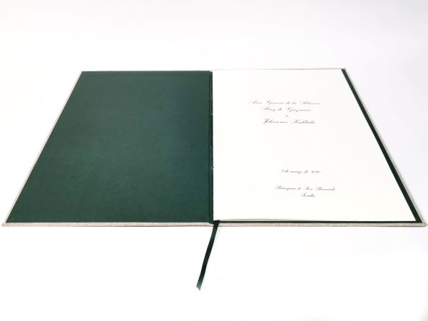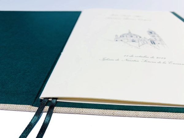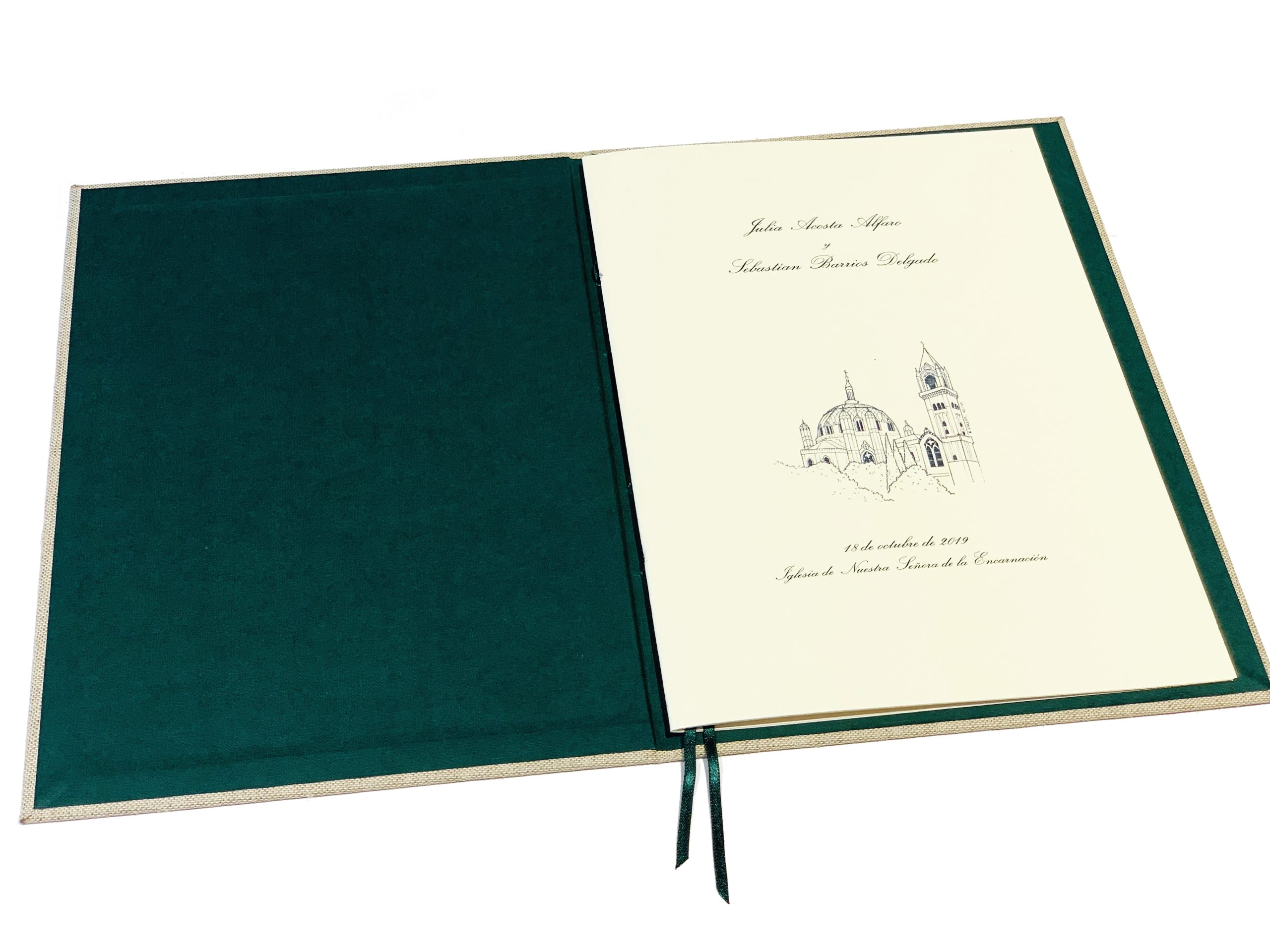 La portada se personaliza con los nombre de pila de los novios y la fecha. Color de estampación: verde.