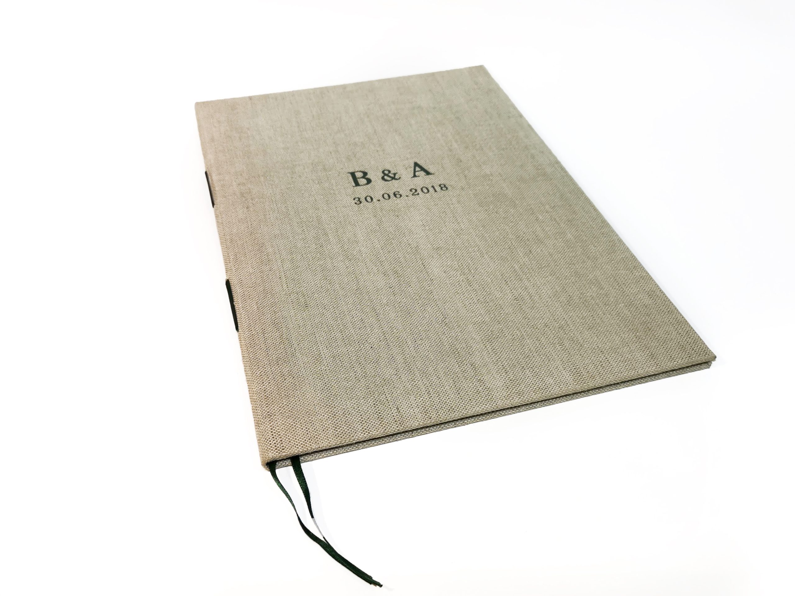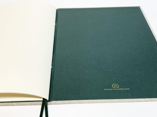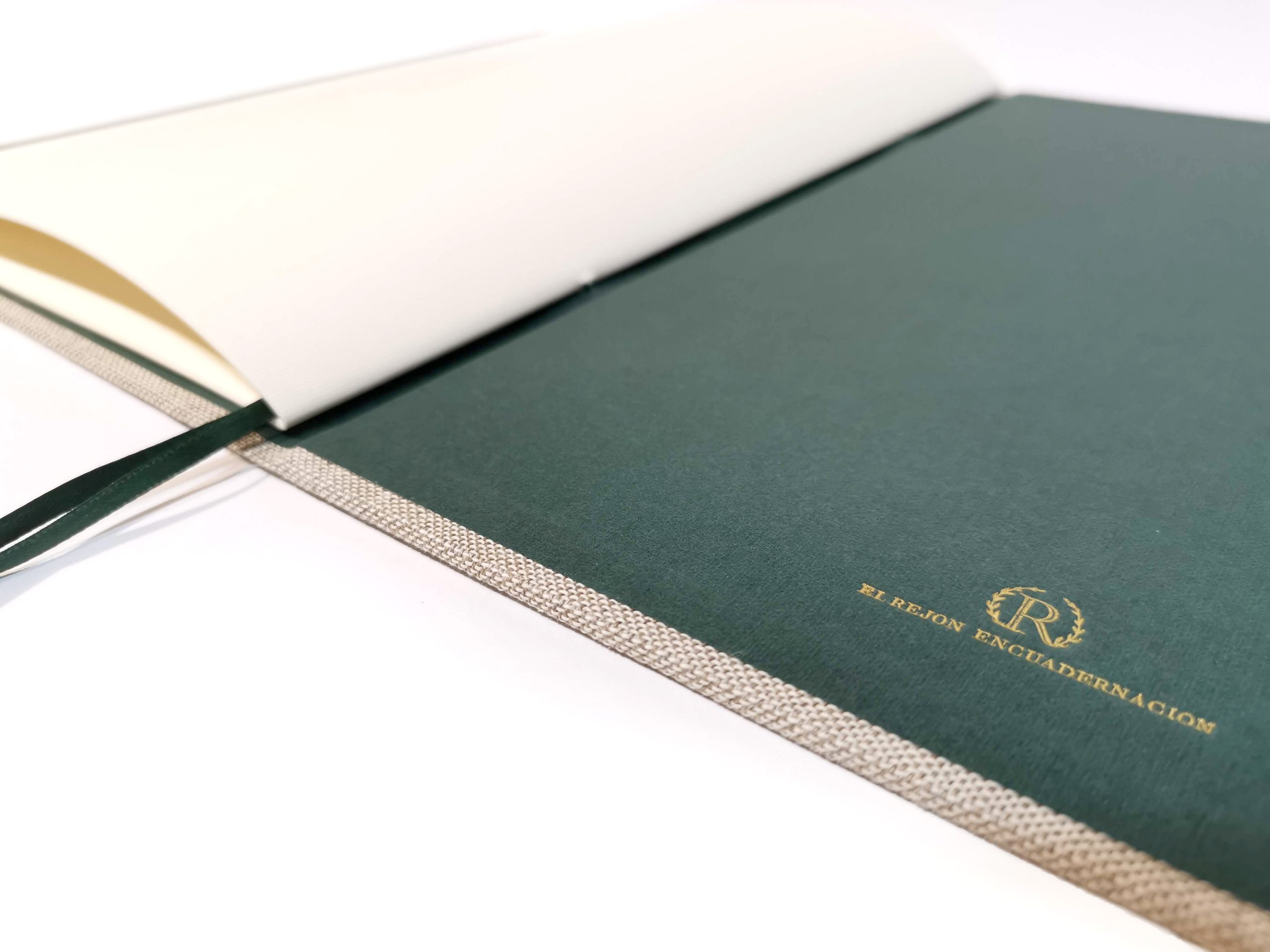 Tela de lino crudo color natural en portada e interior de papel color verde.