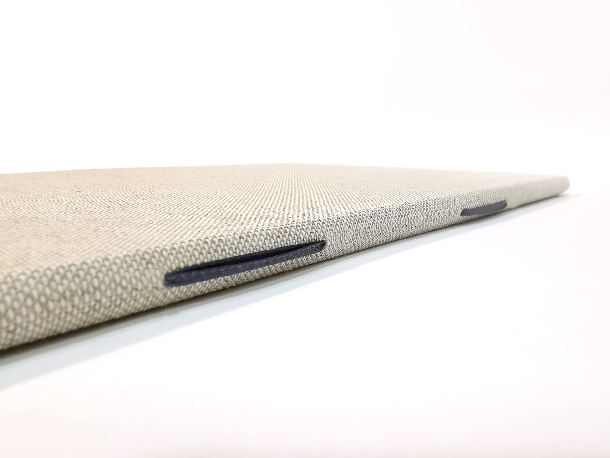 Tela de lino crudo color natural en portada e interior de papel gris oscuro.