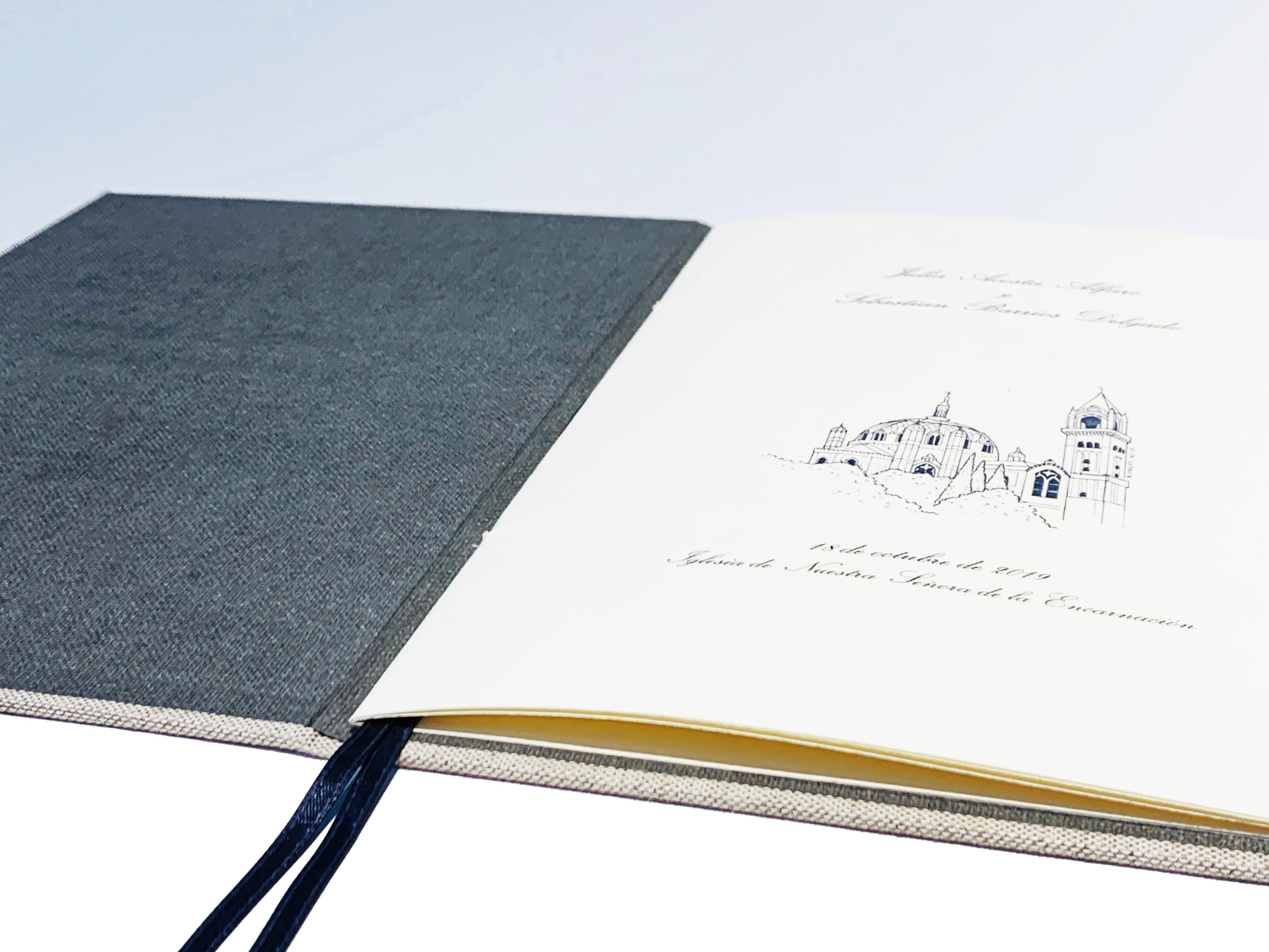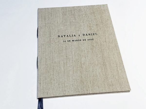 La portada se personaliza con los nombre de pila de los novios y la fecha. Color de estampación: gris oscuro.