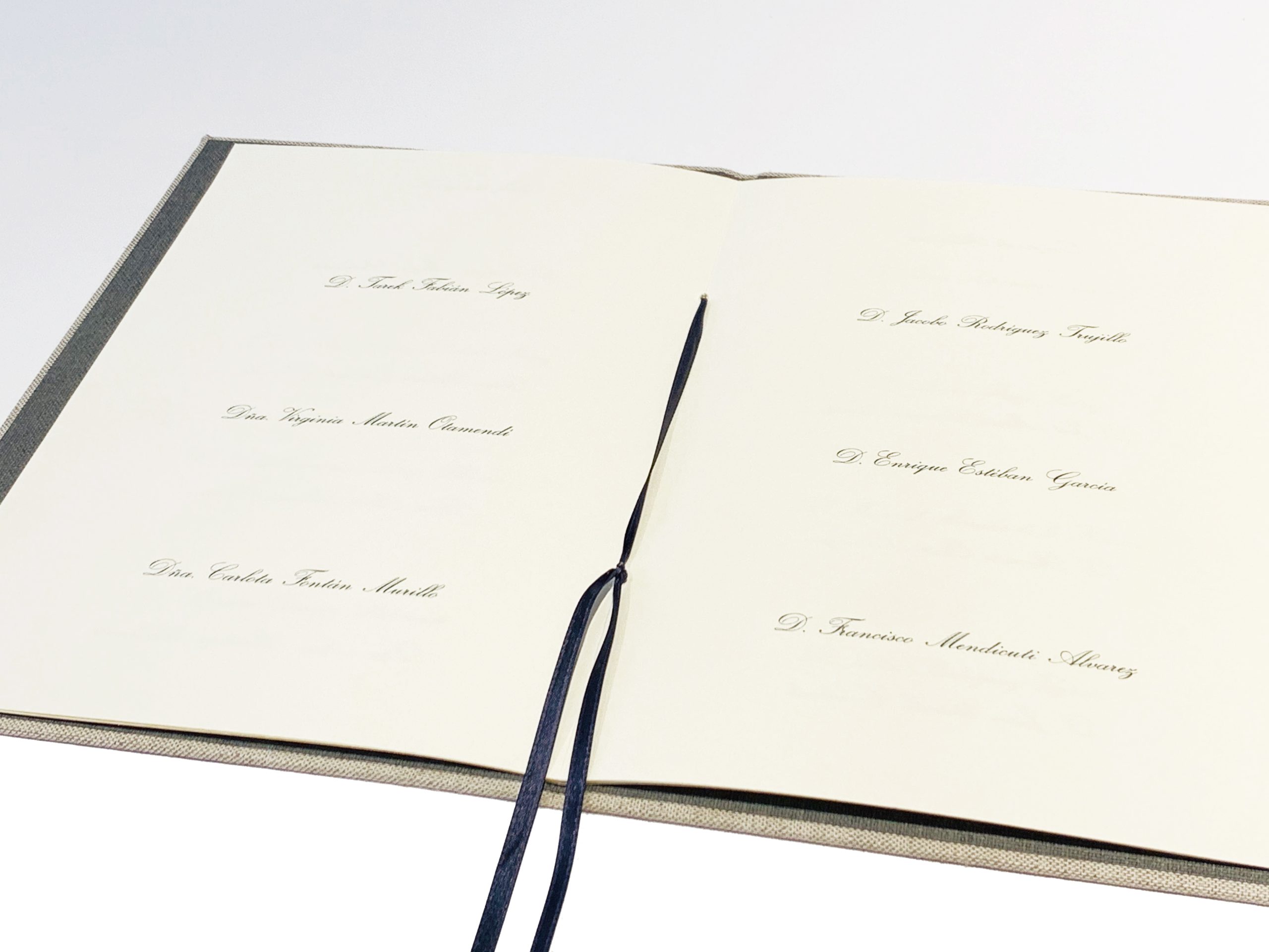 Hasta 12 hojas de 160grs. color marfil. Sujeción de hojas con cinta o lazo color gris oscuro.