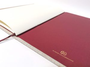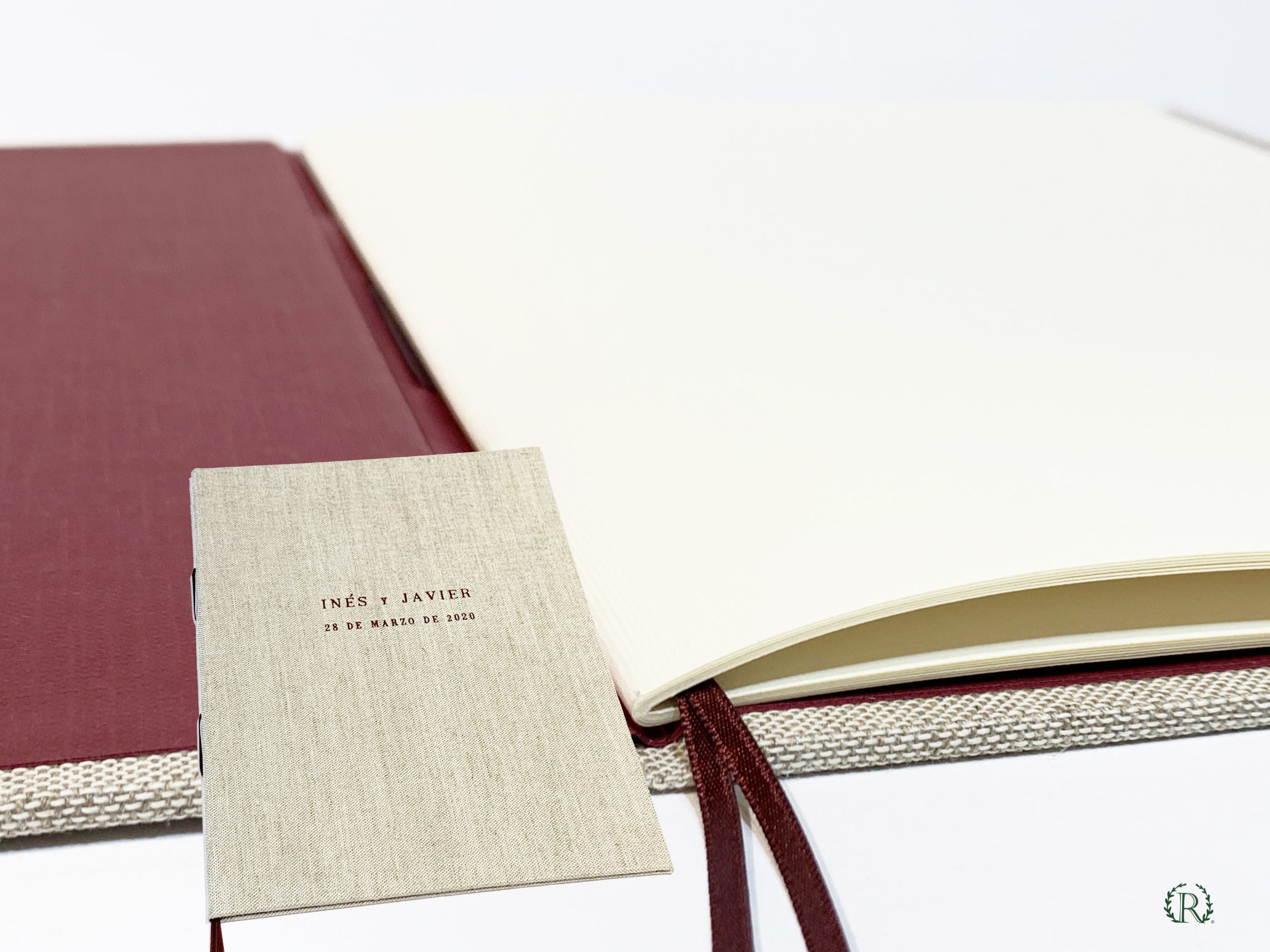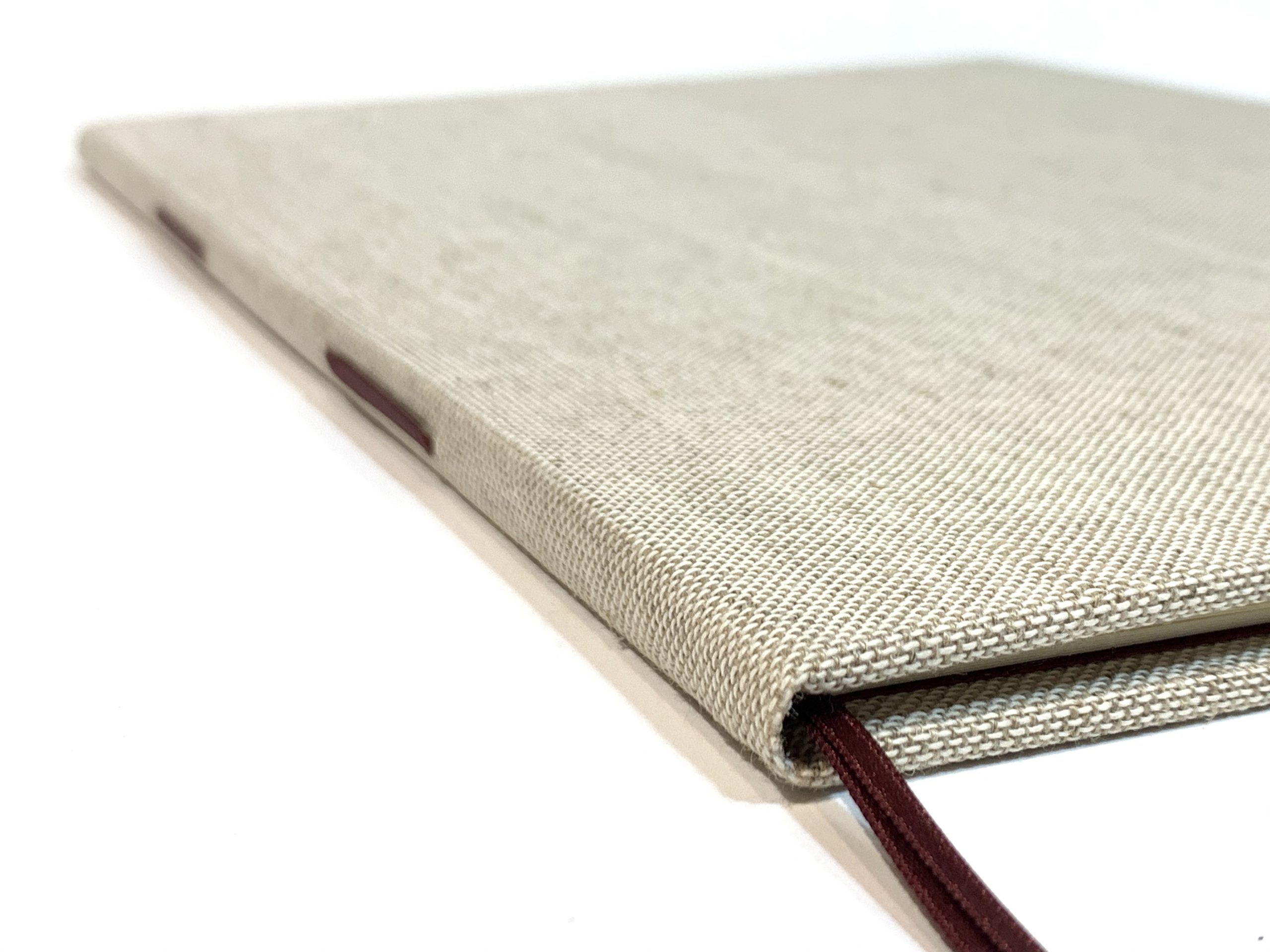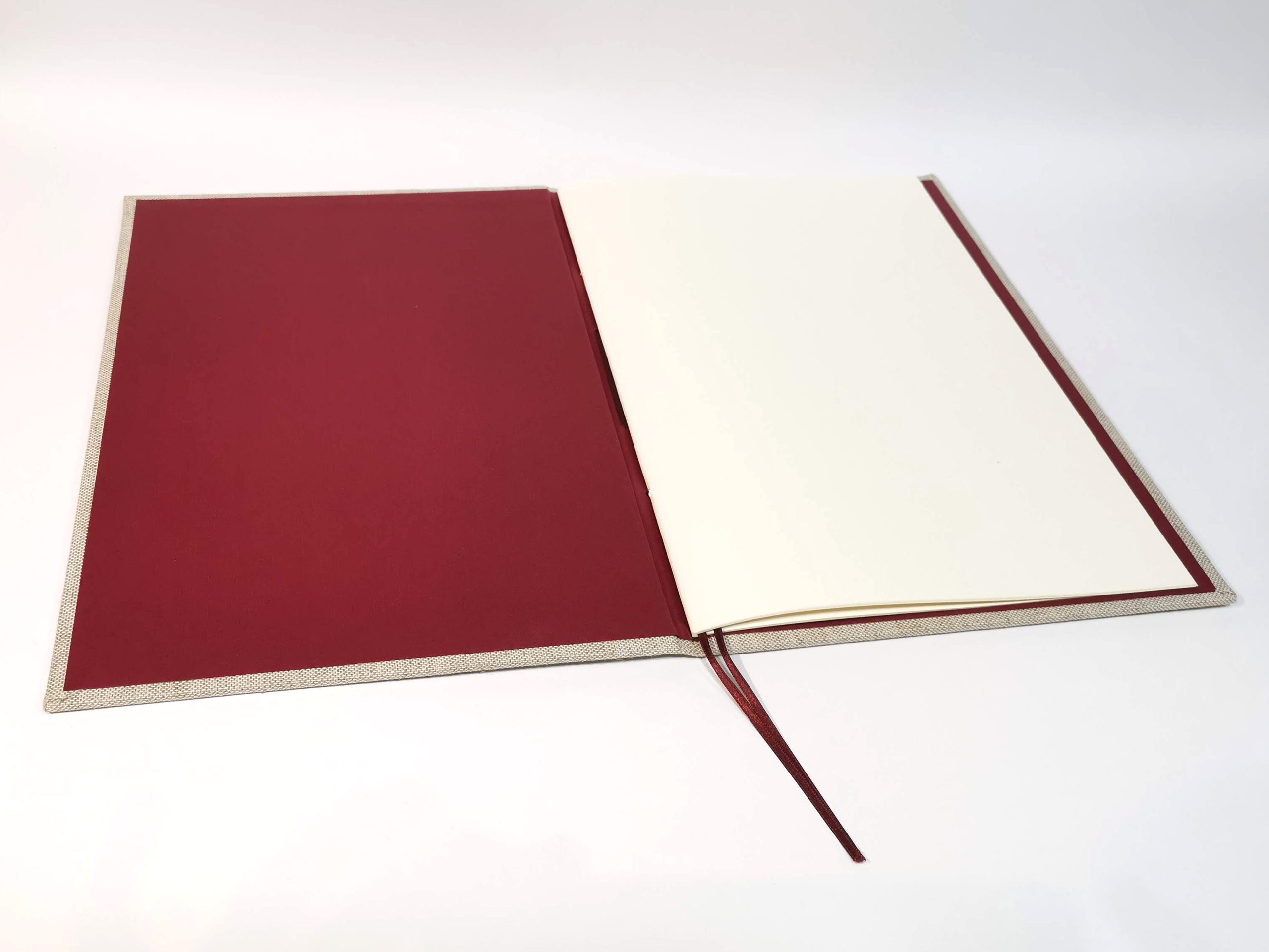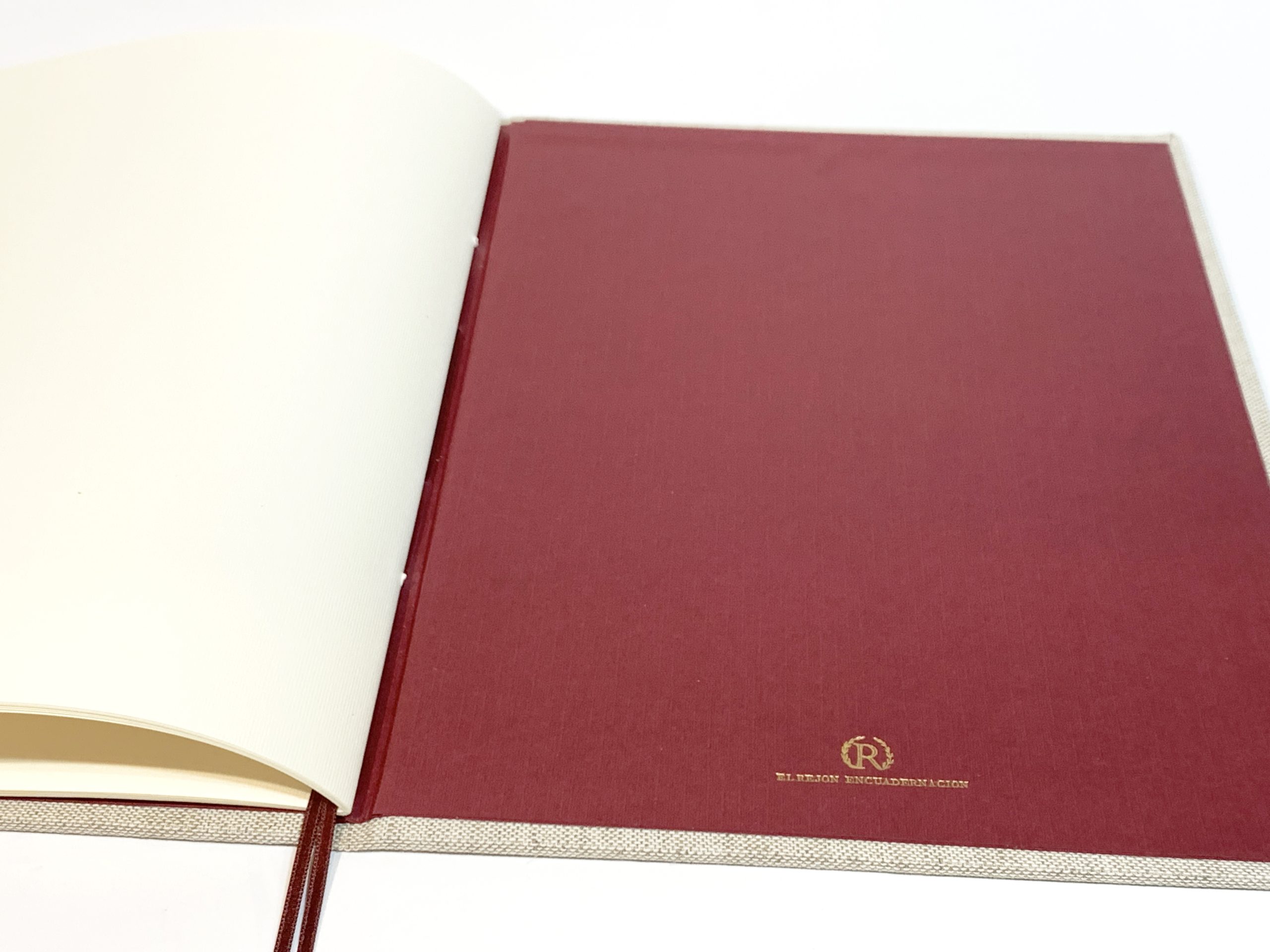 Tela de lino crudo natural en tapas e interior encuadernado con papel burdeos texturado.