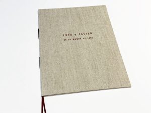 Este trabajo incluye la realización de las tapas en tela, la estampación de la portada en autentico relieve con los nombres de los novios y fecha, y 12 hojas de 160grs. verjuradas color marfil.