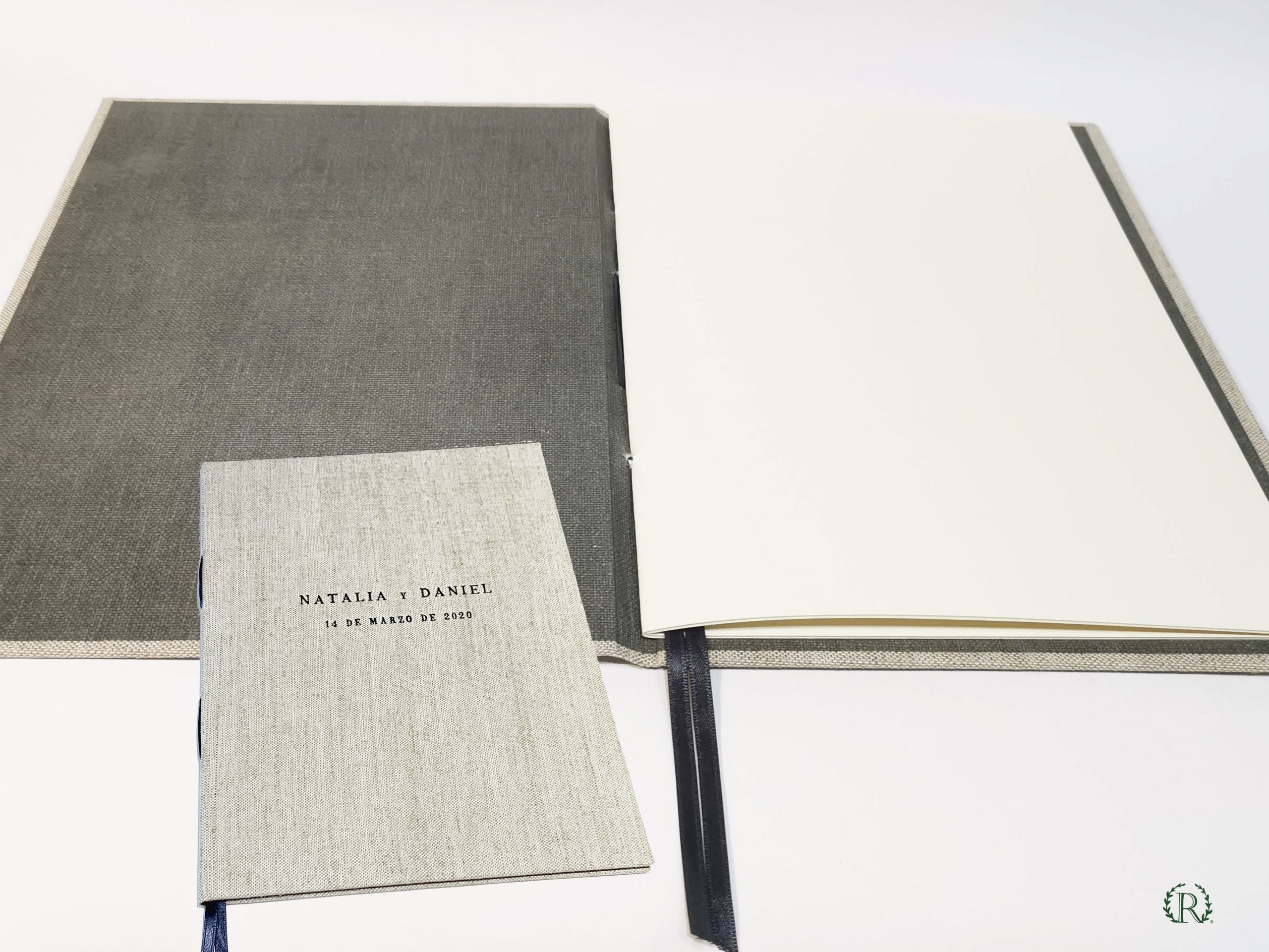 La portada se personaliza con los nombre de pila o iniciales de los novios y la fecha en dos líneas de texto. Color de la estampación: gris oscuro.
