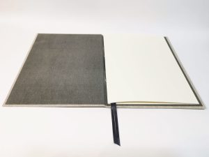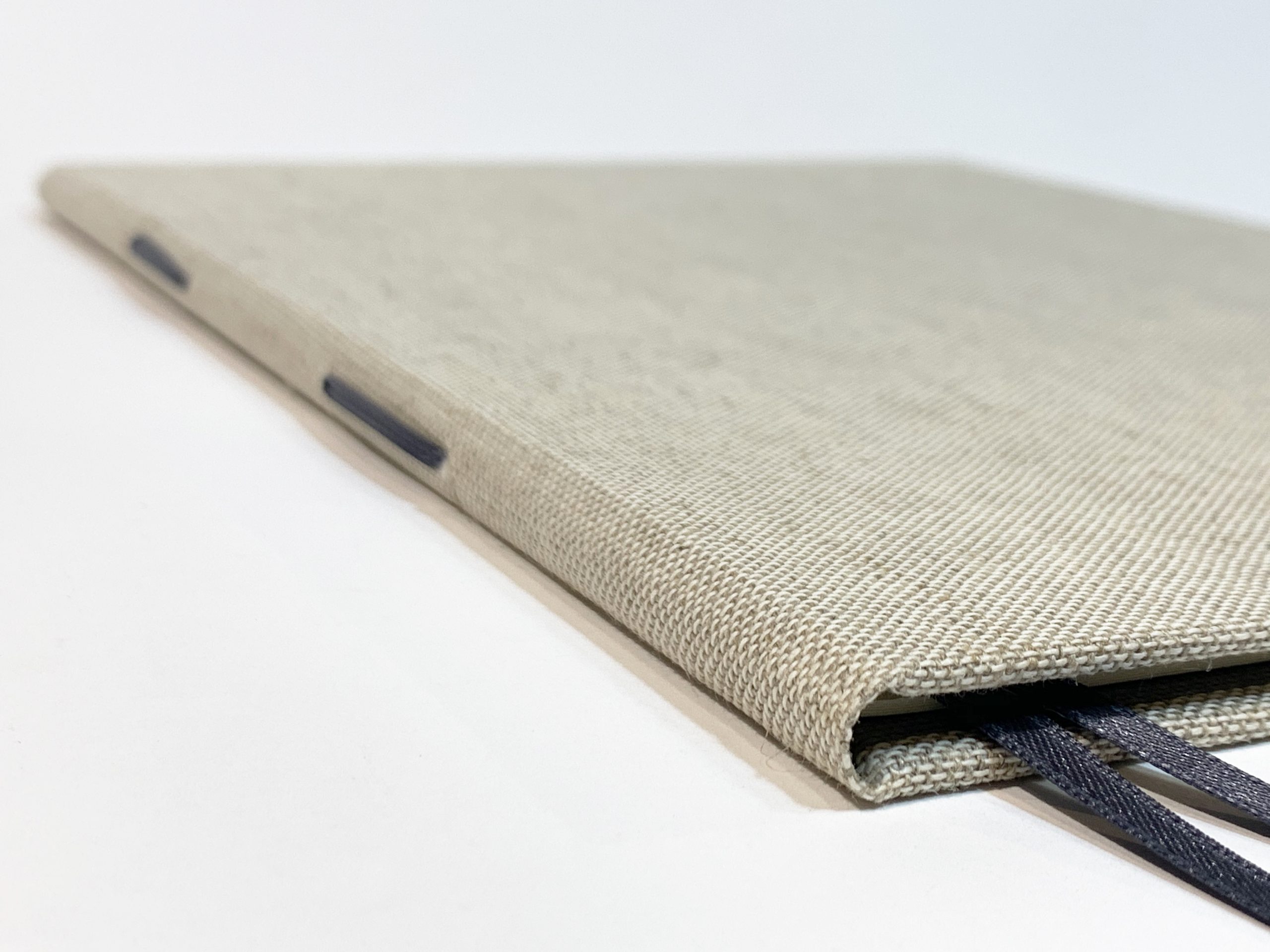 Tela de lino grueso color natural en tapas e interior encuadernado con papel texturado color gris.