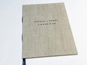 Este trabajo incluye la realización de las tapas en tela, la estampación de la portada en autentico relieve con los nombres de los novios y fecha, y 12 hojas de 160grs. verjuradas color marfil.