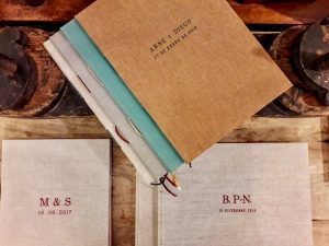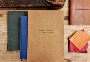 Este trabajo incluye la realización de las tapas en tela, la estampación de la portada en autentico relieve con los nombres de los novios y fecha, y 12 hojas de 160grs. verjuradas color marfil.