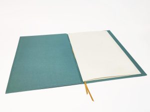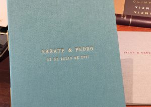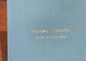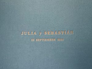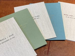 Este trabajo incluye la realización de las tapas en tela, la estampación de la portada en autentico relieve con los nombres de los novios y fecha, y 12 hojas de 160grs. verjuradas color marfil.