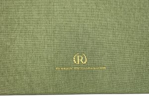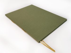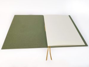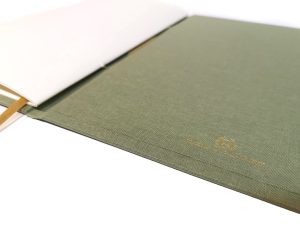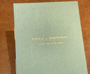 Este trabajo incluye la realización de las tapas en tela, la estampación de la portada en autentico relieve con los nombres de los novios y fecha, y 12 hojas de 160grs. verjuradas color marfil.