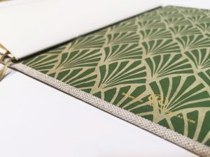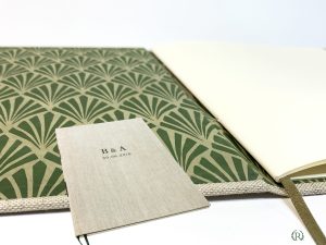 La portada se personaliza con los nombre de pila o iniciales de los novios y la fecha en dos líneas de texto. Color de la estampación: verde.