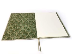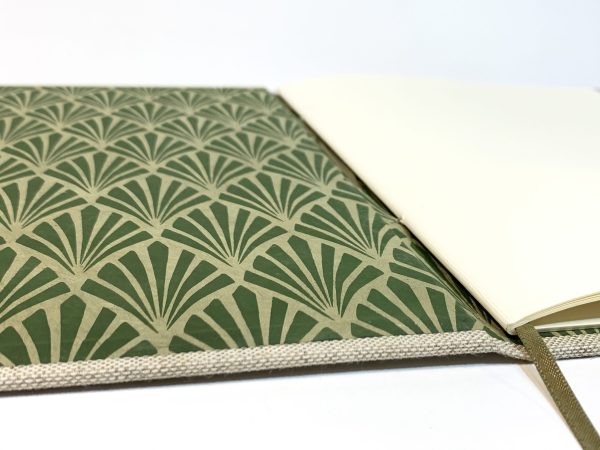 Tela de lino grueso color natural en tapas e interior encuadernado con papel de nepal decorado.