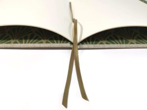 Este trabajo incluye la realización de las tapas en tela, la estampación de la portada en autentico relieve con los nombres de los novios y fecha, y 12 hojas de 160grs. verjuradas color marfil.