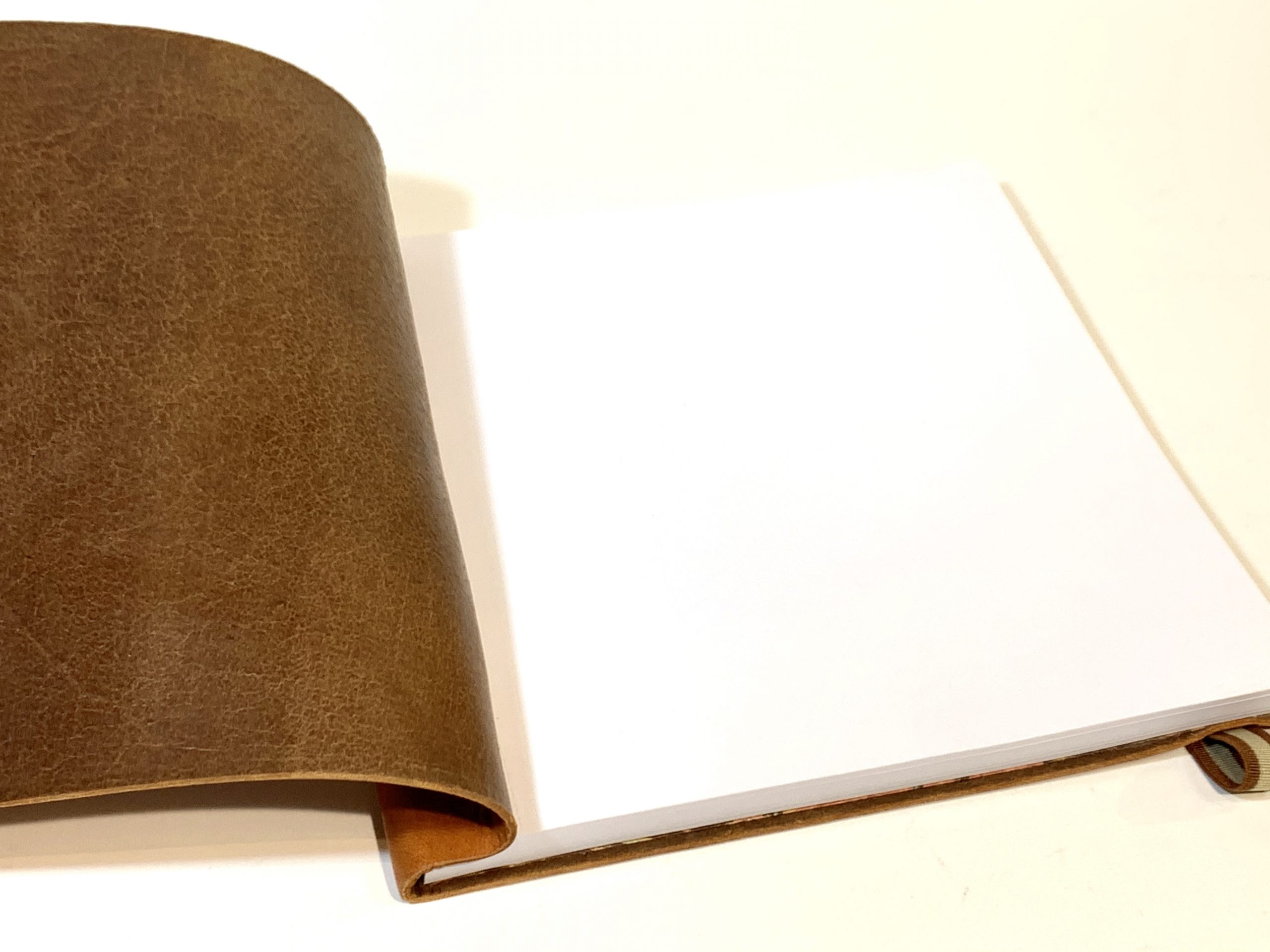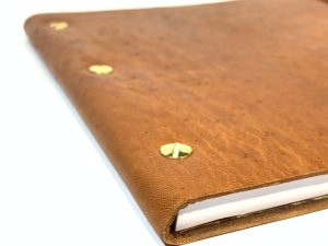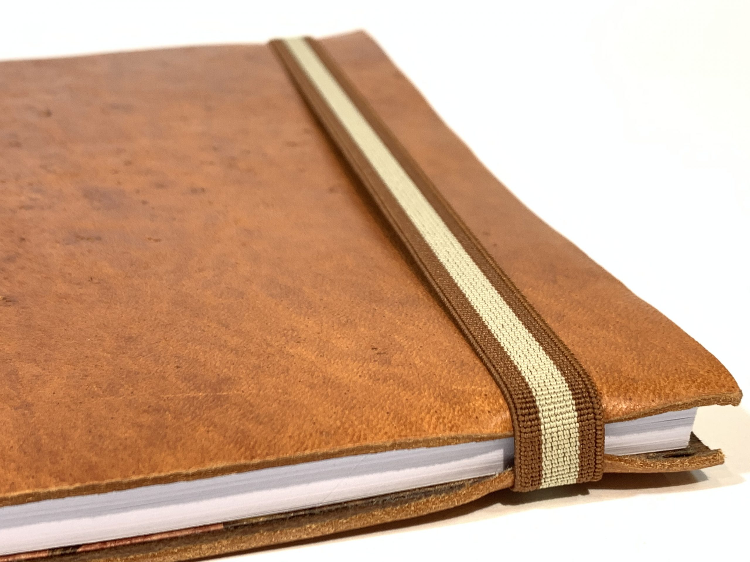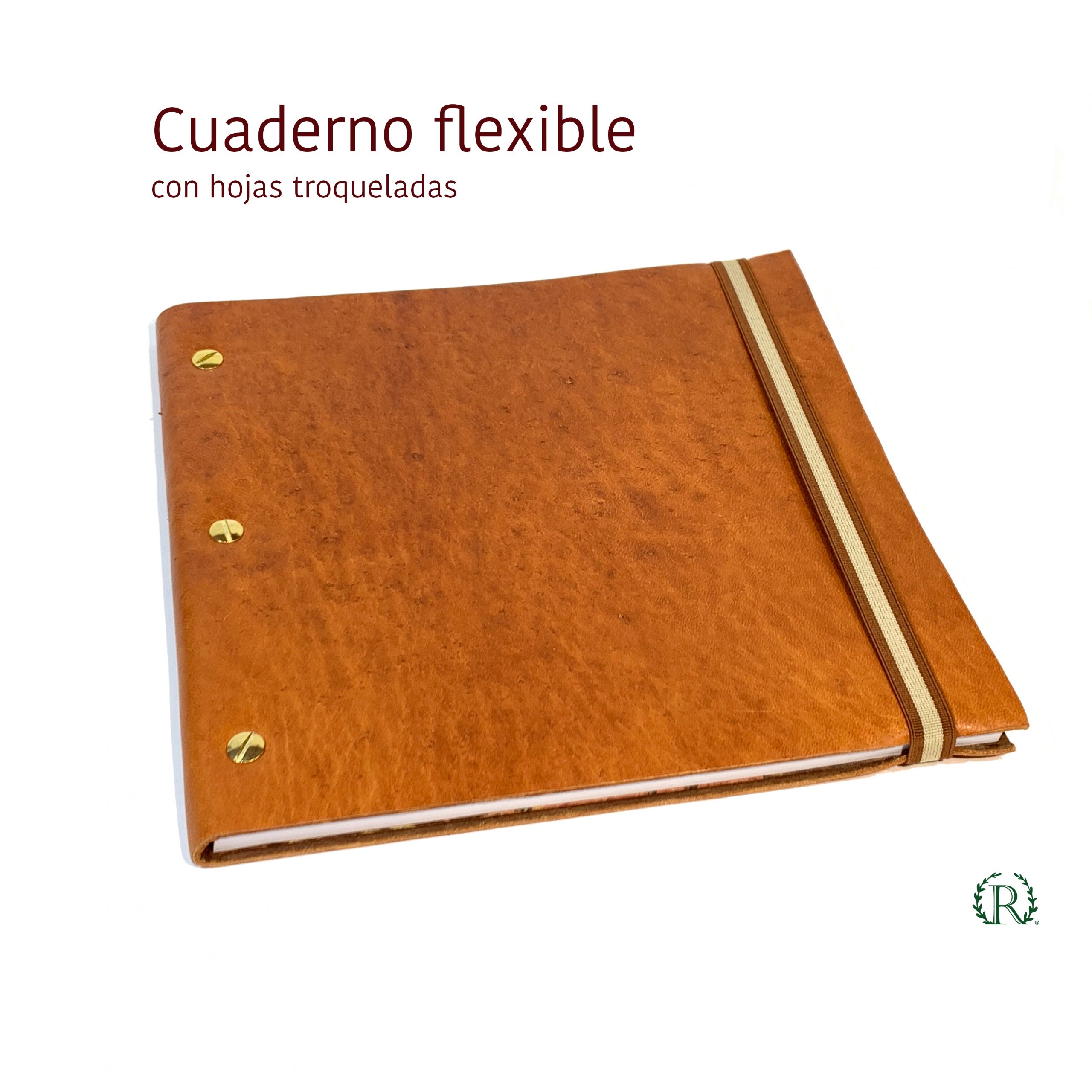 Cuaderno de tapa flexible con cubierta en piel de ciervo, sujeción de hojas con tornillos dorados, y sujeción de tapas con goma plana bicolor.