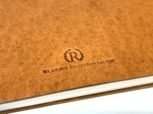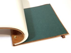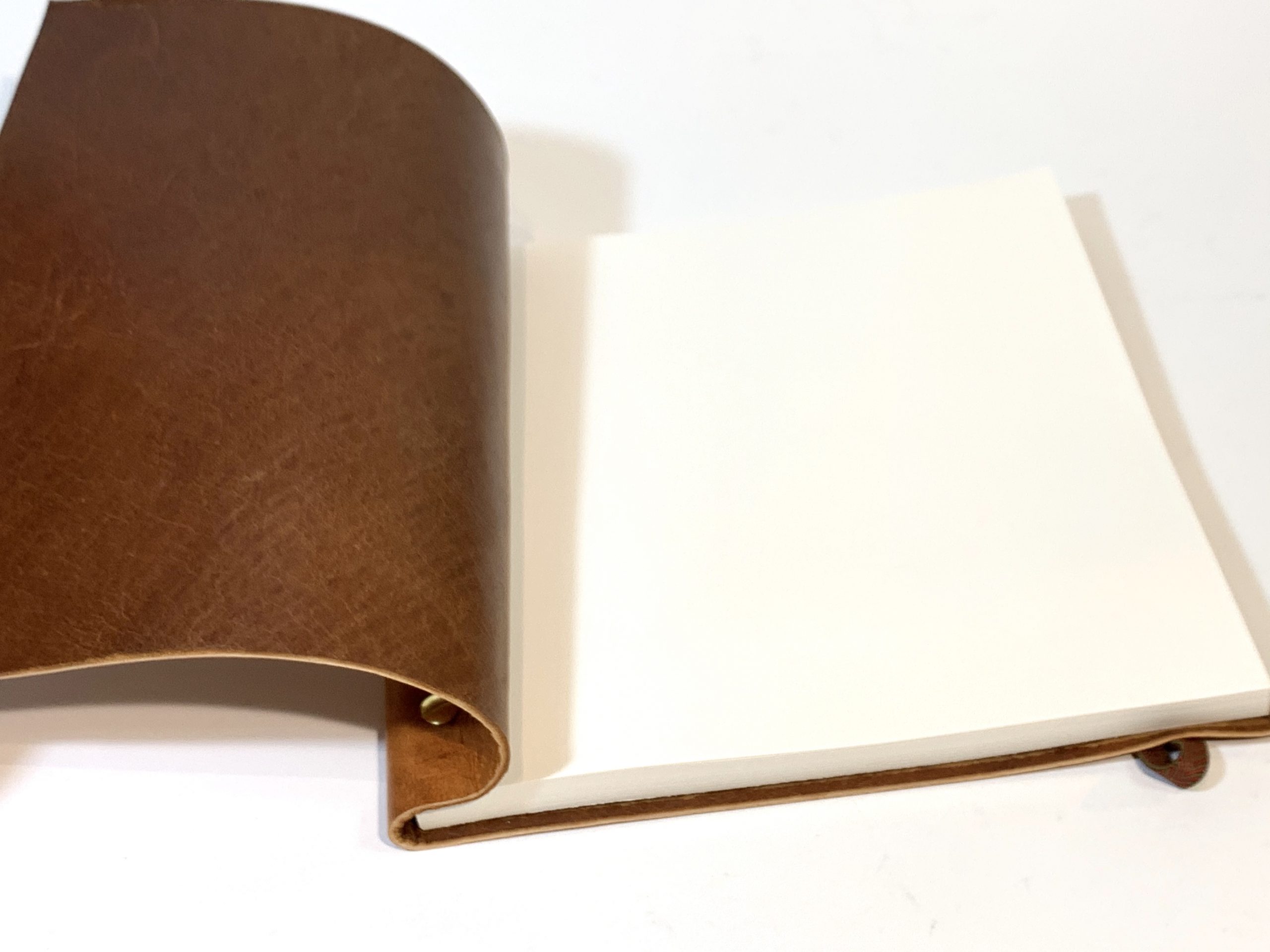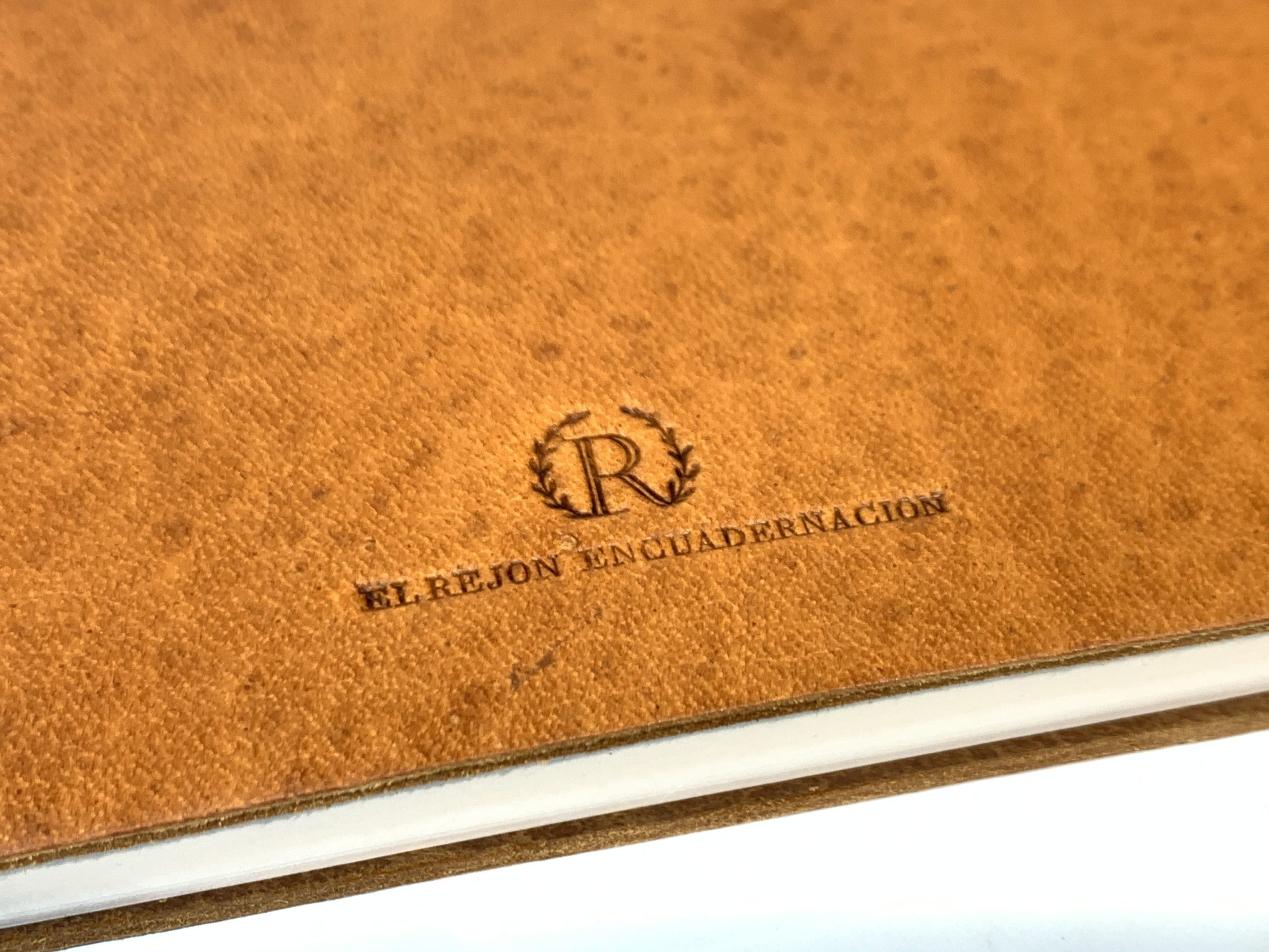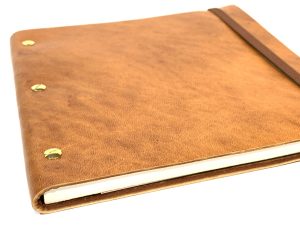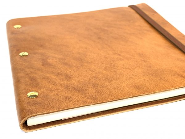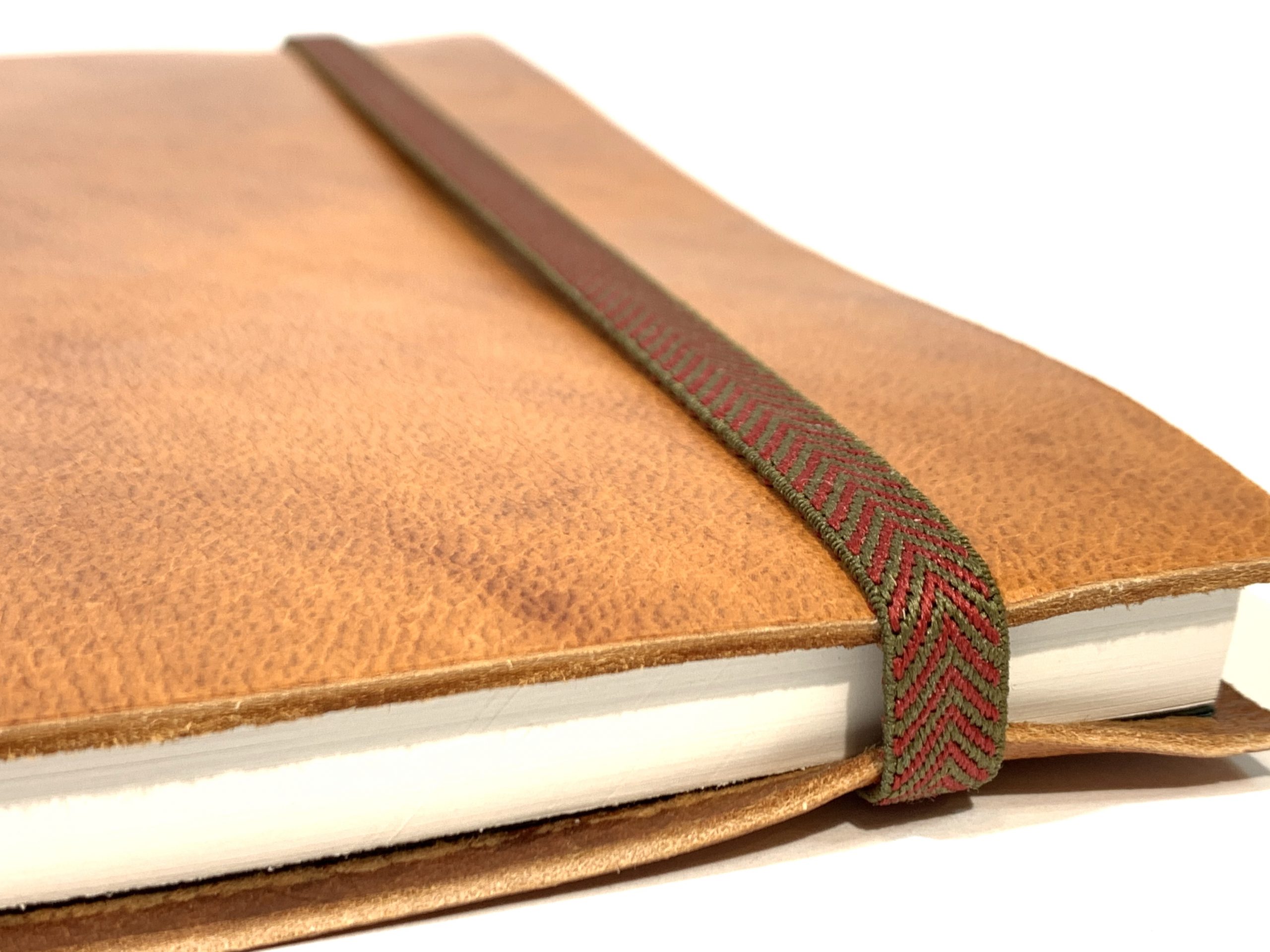 Cuaderno de tapa flexible con cubierta en piel de ciervo, sujeción de hojas con tornillos dorados, y sujeción de tapas con goma plana bicolor.