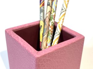 Cubilete con estructura de madera y forrado en piel de búfalo color rosa palo.
