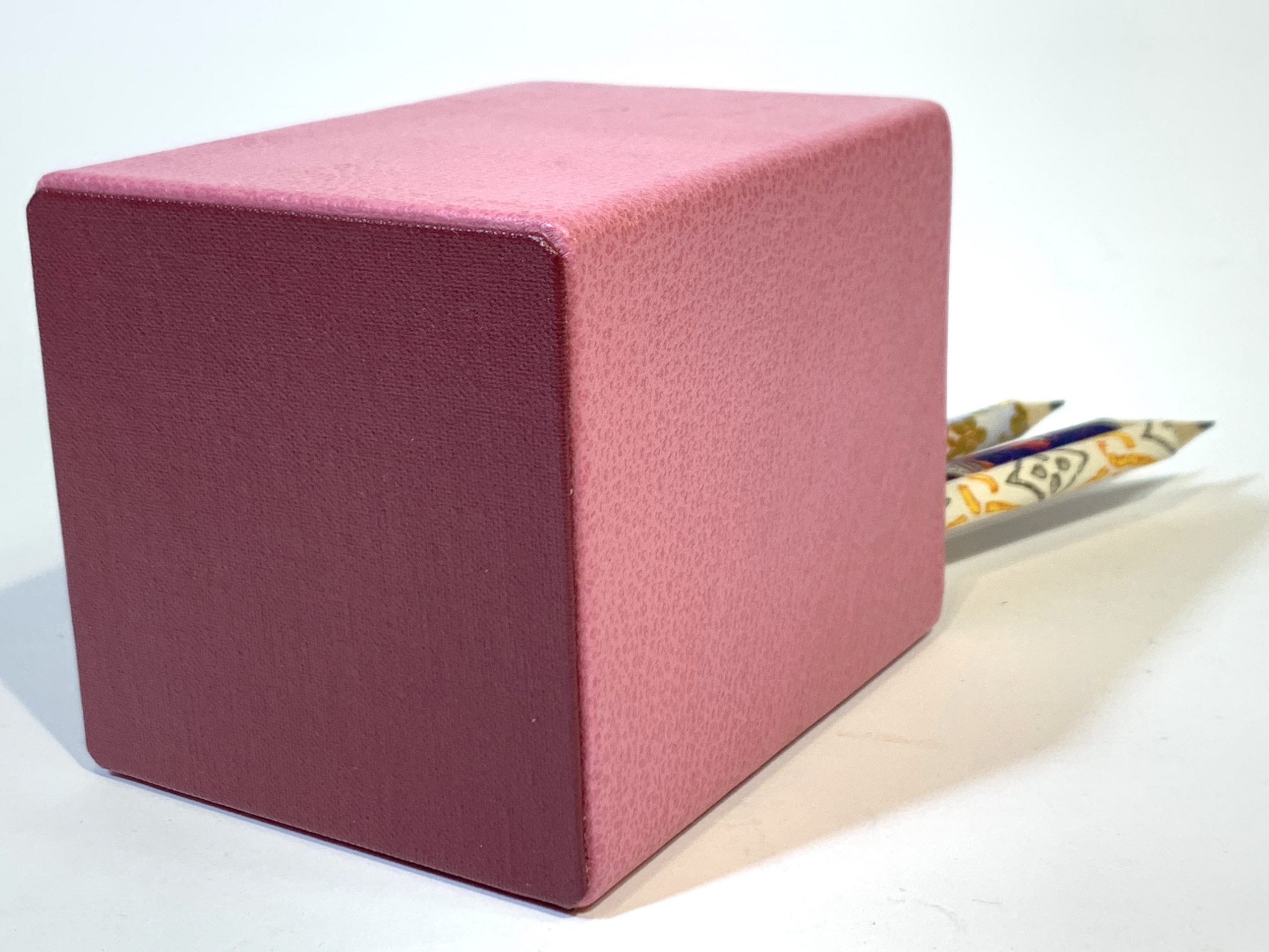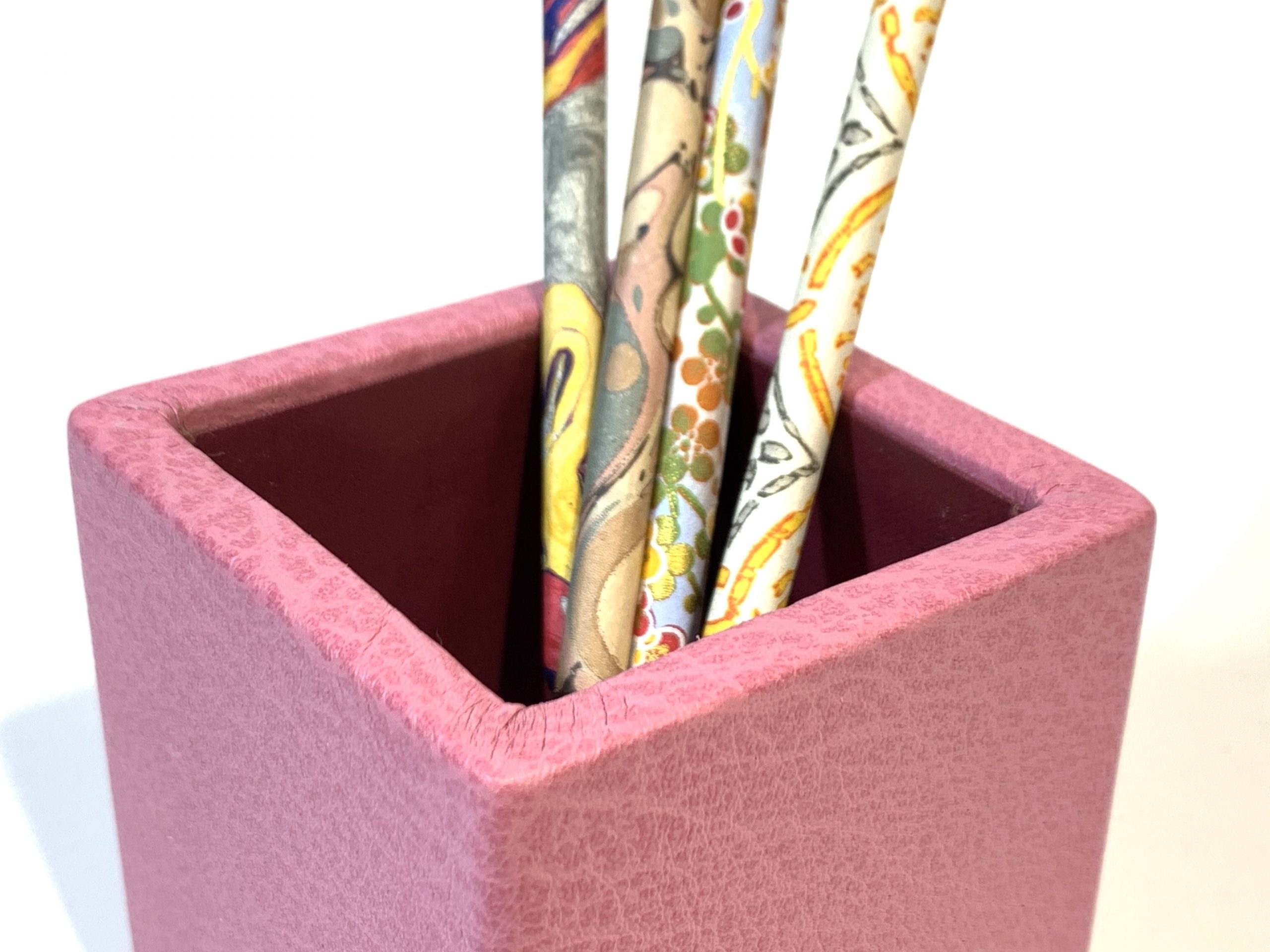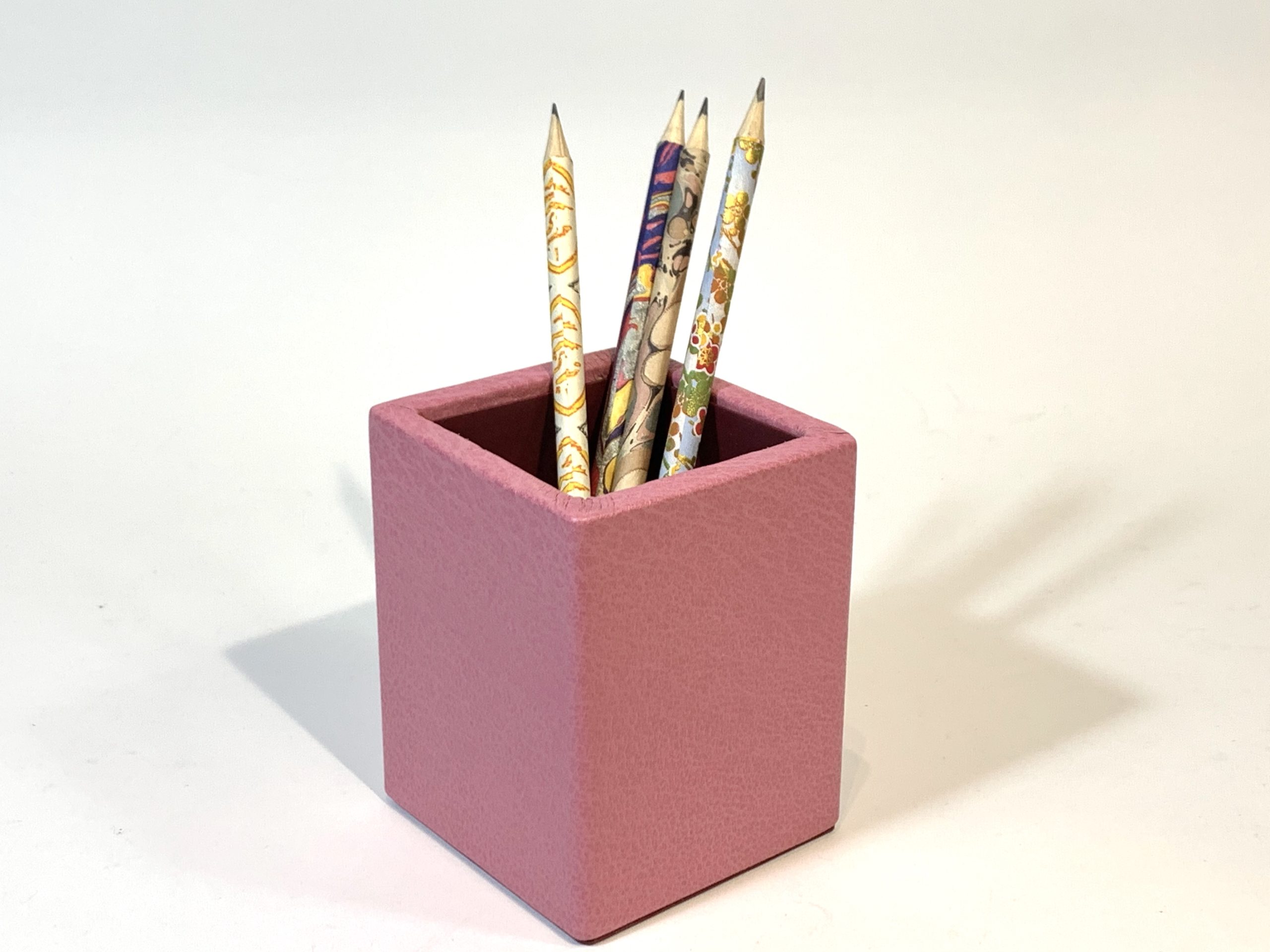 Cubilete con estructura de madera y forrado en piel de búfalo color rosa palo.
