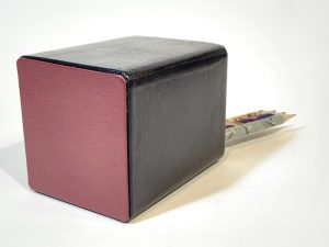 Cubilete con estructura de madera y forrado en piel de cabra color azul marino.