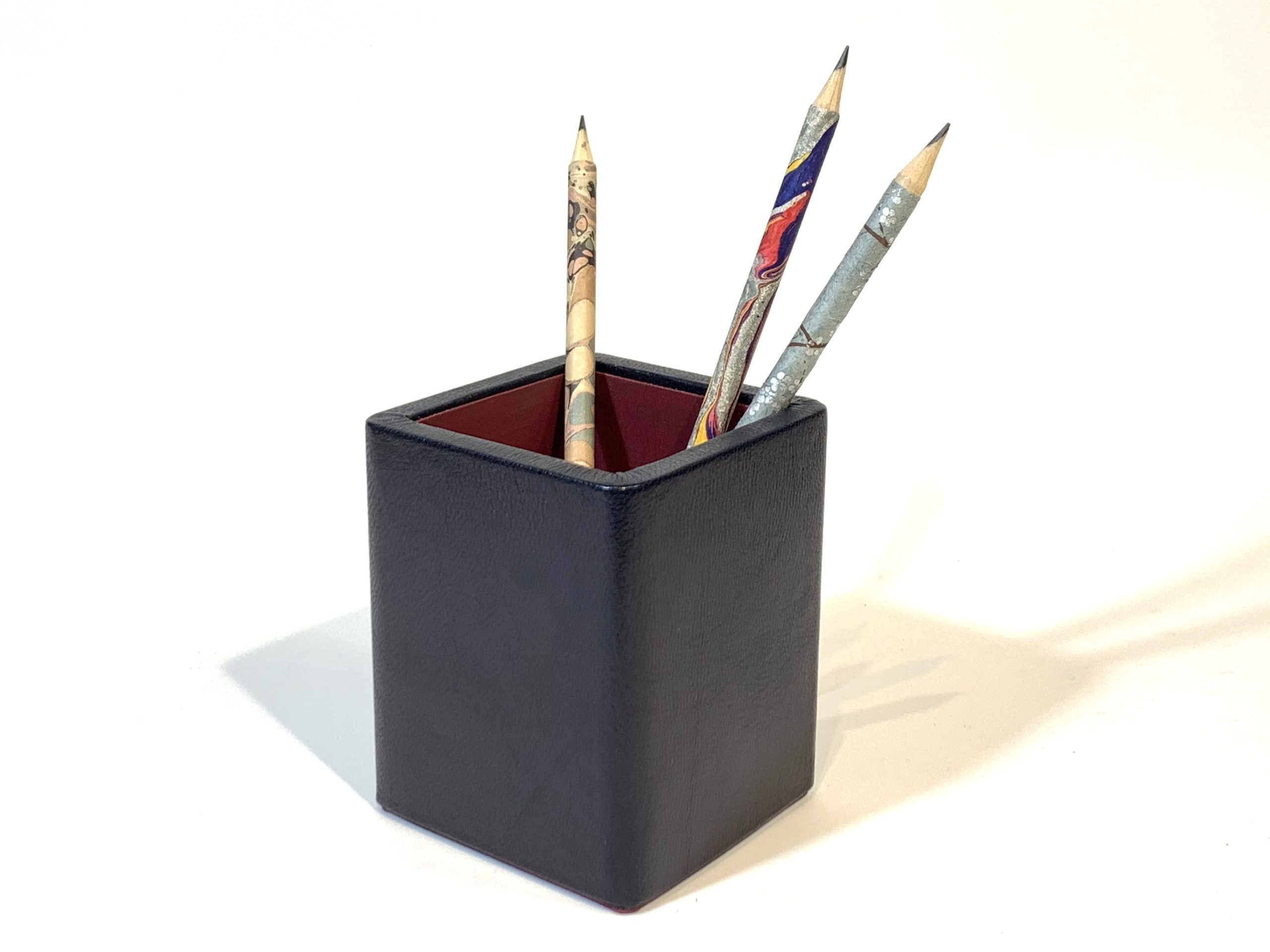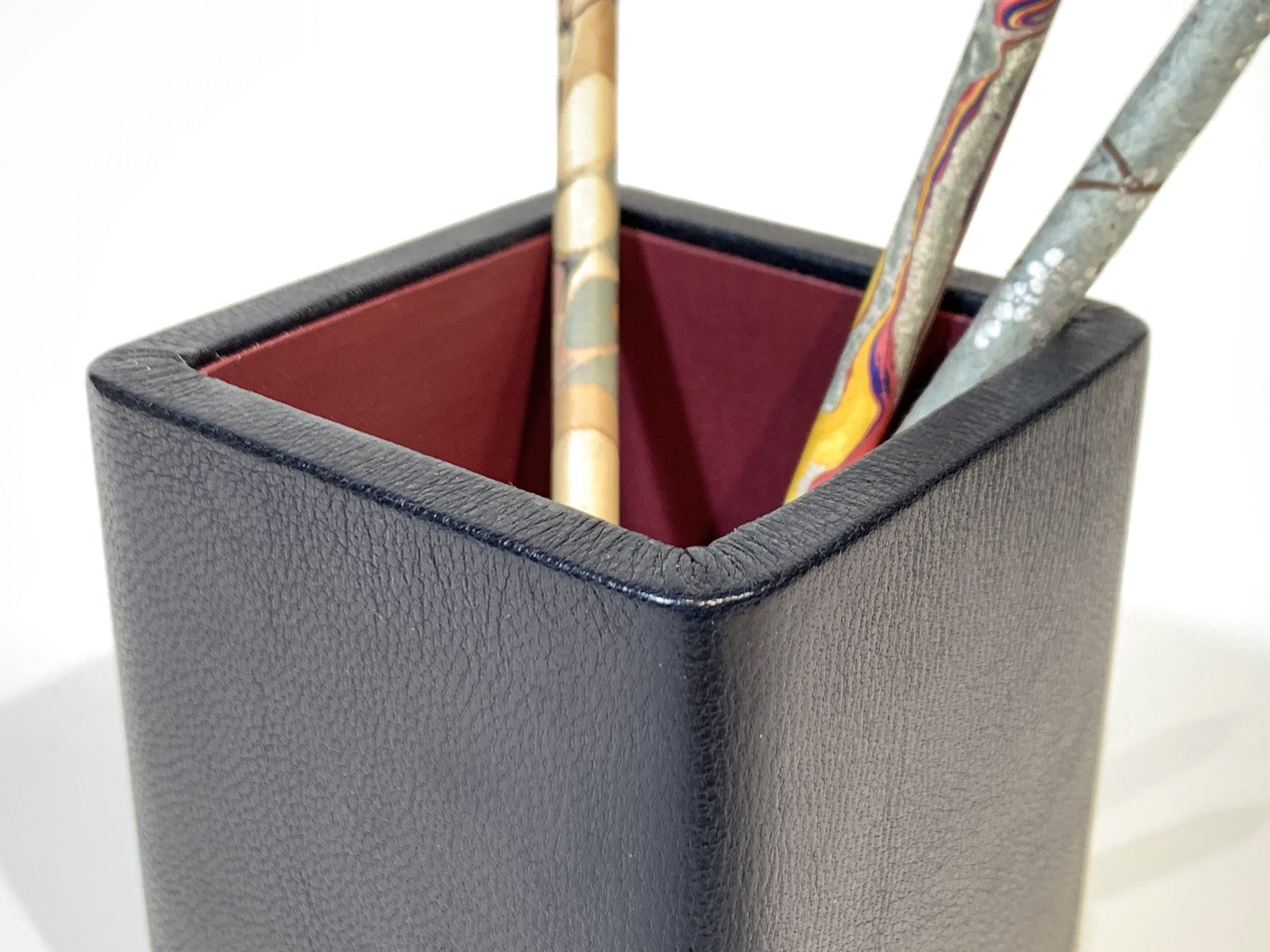 Cubilete con estructura de madera y forrado en piel de cabra color azul marino.