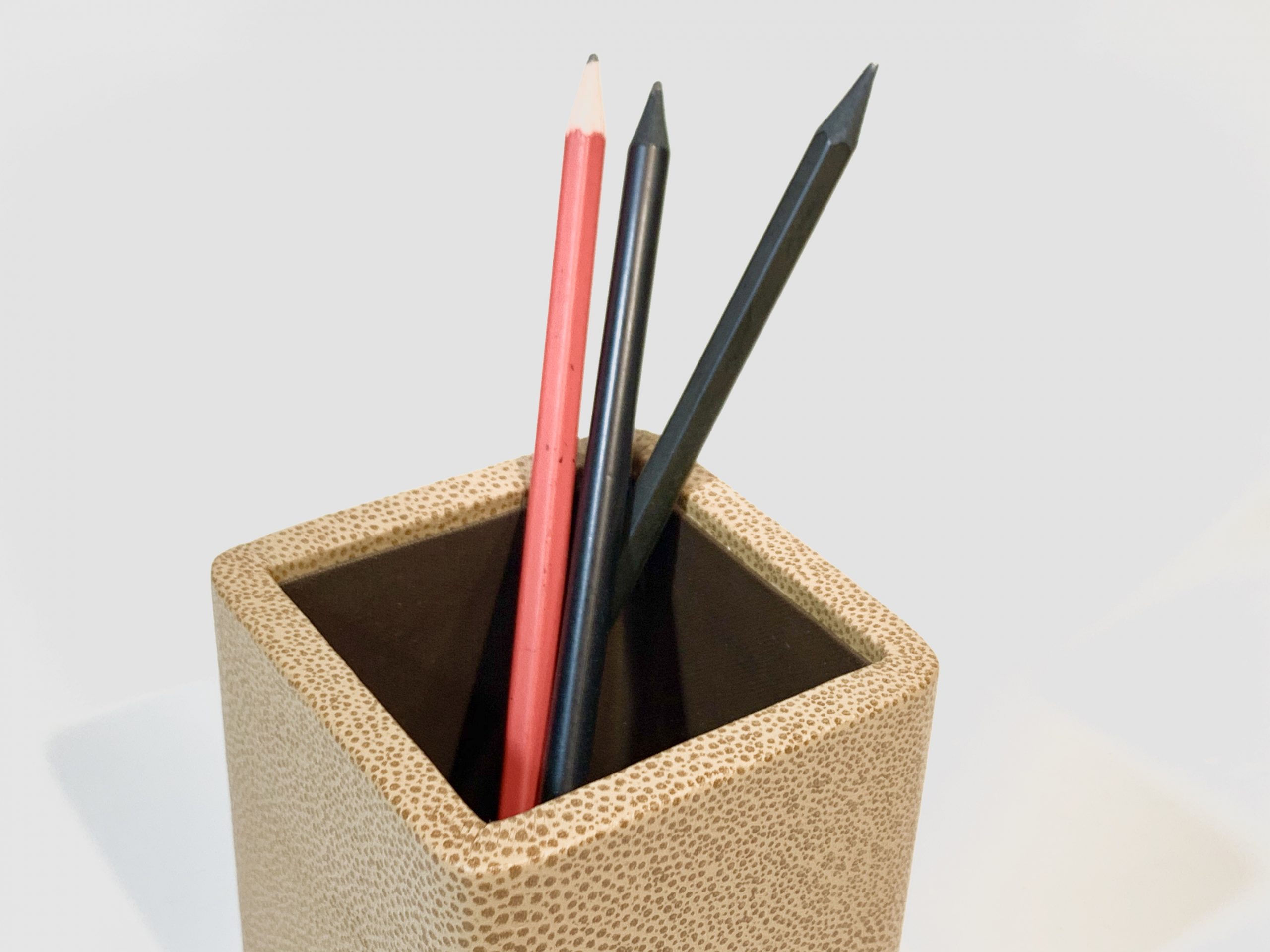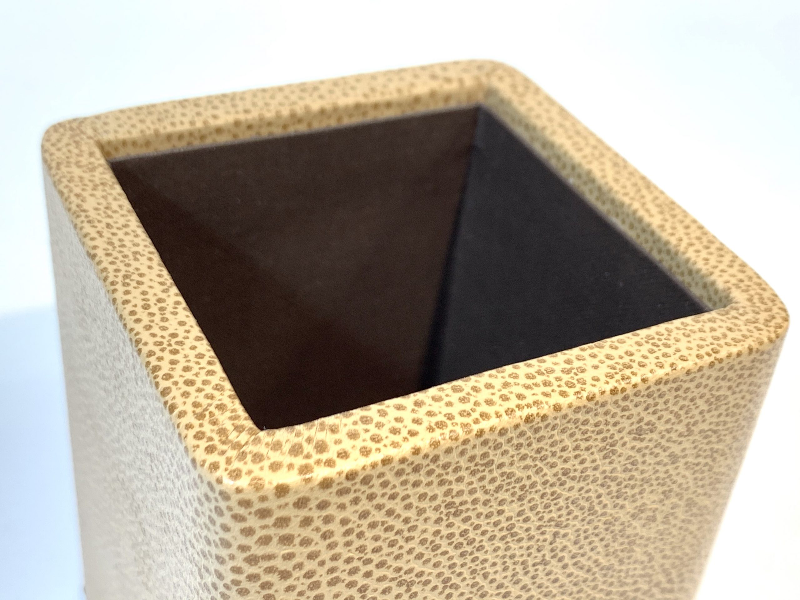 Cubilete con estructura de madera y forrado en piel de vacuno de textura galuchat color ocre.